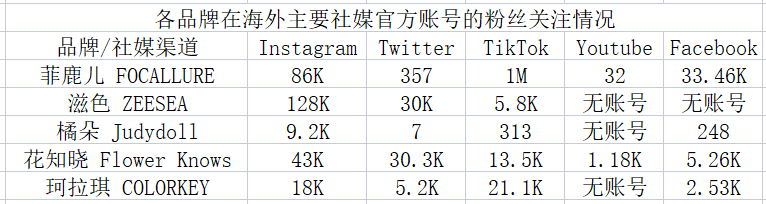 通过统计五个国货美妆品牌在Instagram、Twitter、TikTok、YouTube、Facebook上官方账号的粉丝关注情况。可以发现,这些美妆品牌在营销渠道的选择上,均有所取舍。