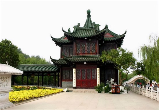 穿过徐园,站到小虹桥上,会有豁然开朗的感觉。西侧,是瘦西湖最开阔的景区,再回过头看徐园,就知道它只是一道序幕,从现在开始,瘦西湖景区将渐渐拉开,进入高潮了。东面的一座楼,叫做“四桥烟雨”。每当“山色空蒙雨亦奇”之际,这里领略的景致是“四桥飞跨烟雾里”。站在这座楼上,大家可以看到四座色彩和造型各有不同的春波桥、大虹桥、长春桥、莲花桥。烟雨朦胧中,四座桥有远有近,有浓有淡,有高有低。当年乾隆皇帝十分喜爱这里的景色,多次吟诗作赋,并亲笔御赠“趣园”。