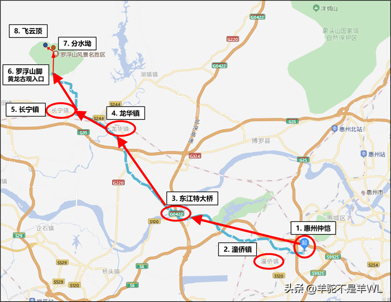 从惠州仲恺高新区出发,惠州博罗县罗浮山方向。