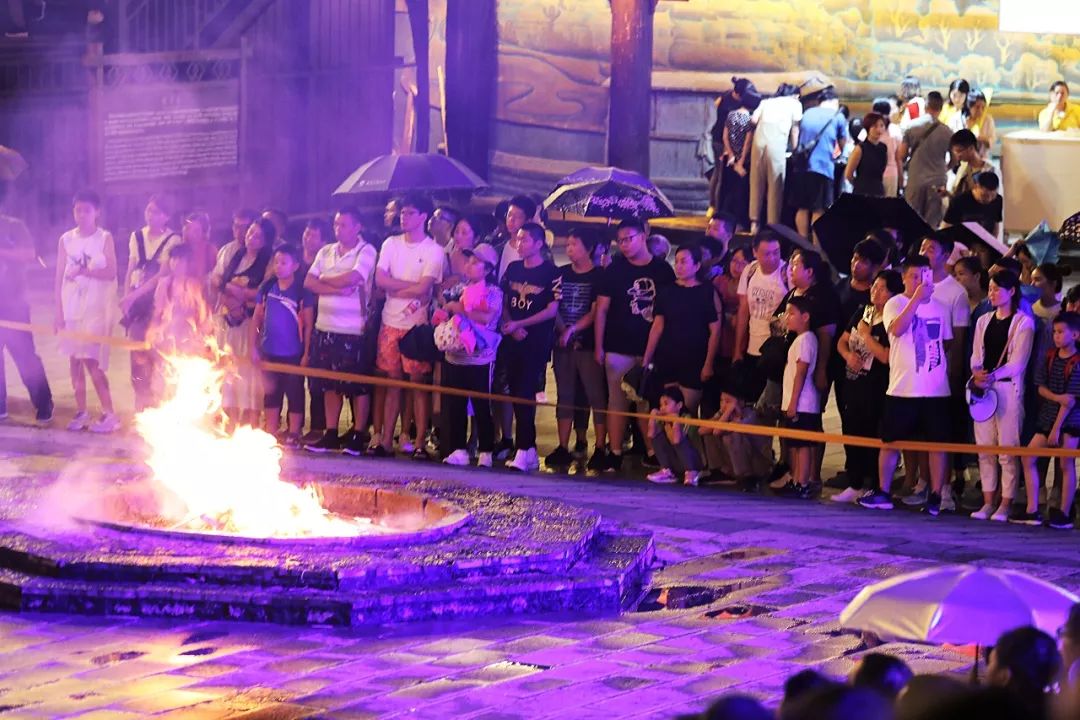 胸口碎大石,上刀山下火海…一开始下着小雨,游客们打着伞围着篝火,演出惹来阵阵掌声。