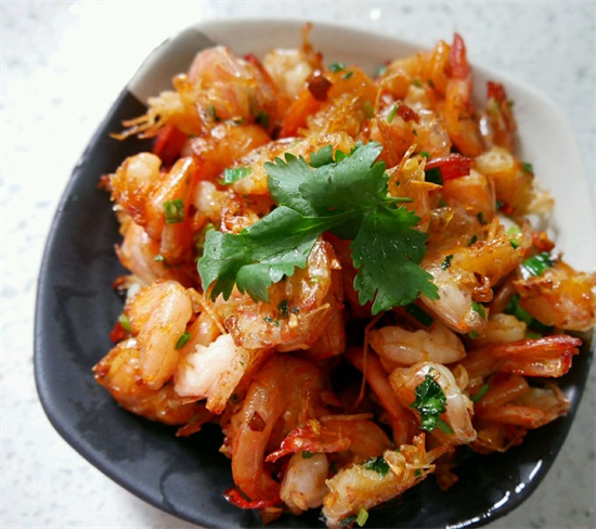 新鲜海虾洗净去头,去虾腥线,开虾背,用15克生抽,5克蚝油,少许胡椒粉,一点点盐【一点点,一点点,一点点!!!海鲜类食品如果放太多盐会失去鲜味】腌制10分钟左右 趁着腌虾的功夫,葱,姜,蒜,辣椒,香菜处理好 一茶匙红薯淀粉加适量冷水调开,水不要加太多,一定要用冷水调开,热水直接把红薯淀粉烫熟了,熟了的红薯淀粉就变粉坨了,调不开 将调好的红薯淀粉水加入腌制好的虾中,搅拌均匀 热锅下油,油要多放点,最好能没过虾【 腌好的虾下锅炸,炸到表皮酥脆【这很重要!!!】 炸好的虾铲出装好,锅内多余的油倒出来,锅内剩余油量只要能盖住锅底就好【节约点,倒出来的油可以做别的菜】 蒜,姜,辣椒下锅翻炒 炸酥的虾入锅同配料一起翻炒 关火,放入葱和香菜,用余温炒香 好啦,现在可以装盘啦,无敌下饭,赶快试试吧