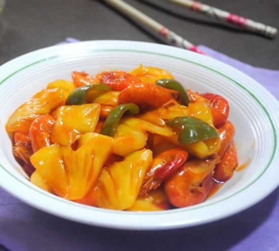 虾剪去须,去黑线洗净后,用厨房纸吸干水分。 放入盐、白胡椒粉、柠檬汁腌汁20分钟左右。 菠萝切片洗净后放入盐水里浸泡。 锅内加热后倒入油,加热至6、7分熟时放入腌制好的虾,炸至颜色变捞出。 锅内留点油,放入番茄沙司、白醋、适量的水加热。 冒泡状时,放入青椒片和虾。 菠萝放入。 大火翻炒至菠萝和虾均匀上色,最后淋少许鲜酱油,翻炒几下就可以出锅。 小贴士: 河虾肉质细嫩,味道鲜美,营养丰富,是高蛋白低脂肪的水产品。 番茄沙司里含有糖,菠萝含有大量的果糖,葡萄糖,所以不需要放糖。