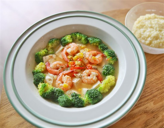白豆腐/嫩豆腐150g、基围虾5支、西兰花50g、玉米粒20g、蘑菇/香菇20g、新鲜辣椒、盐、橄榄油、淀粉、味极鲜、黑胡椒