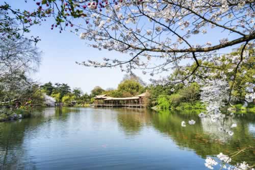 小瀛洲岛在明万历间(16世纪)浚湖堆土而成,呈“湖中有岛,岛中有湖”的“田”字形格局,是江南水上园林的经典。全岛以亭台楼阁配以传统花木构成色彩绚丽的景致,与岛内外水光云天相映,象征了中国古代神话中的蓬莱仙岛。