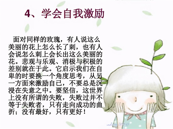 不管你在增强自信的过程中,遭遇到什么样的困难,你都要成为自己的啦啦队,时刻给自己打气、加油。