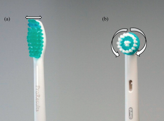 (a) 振动式电动牙刷;(b)旋转震荡式电动牙刷