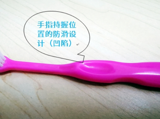 其次,刷柄上相应的手指持握部位最好有凸凹不平的外形设计,同样为了防止牙刷发生不受控制的转动或滑脱。