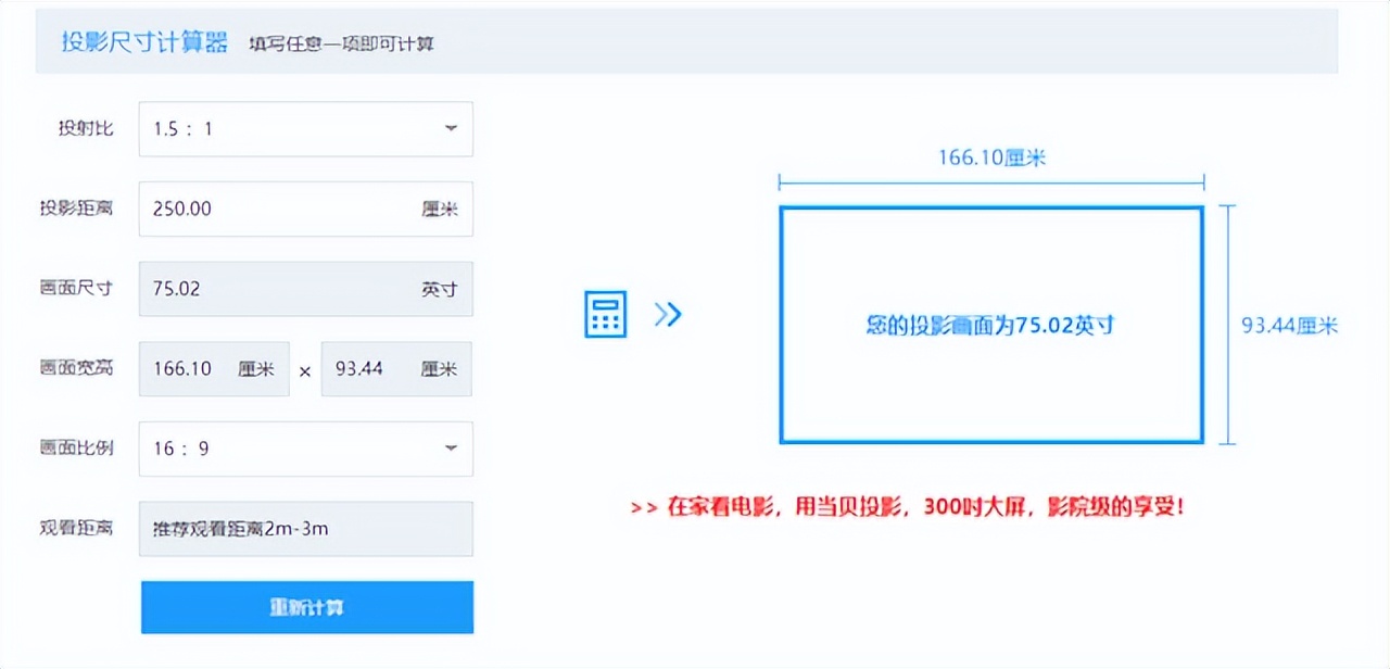 举例:假如你选择了一款正常长焦投射比为1.5的投影仪,投影距离为2.5m,那么投影幕布的宽度应该是:2.5÷1.5≈1.7m,按照这个参数去选就行了。