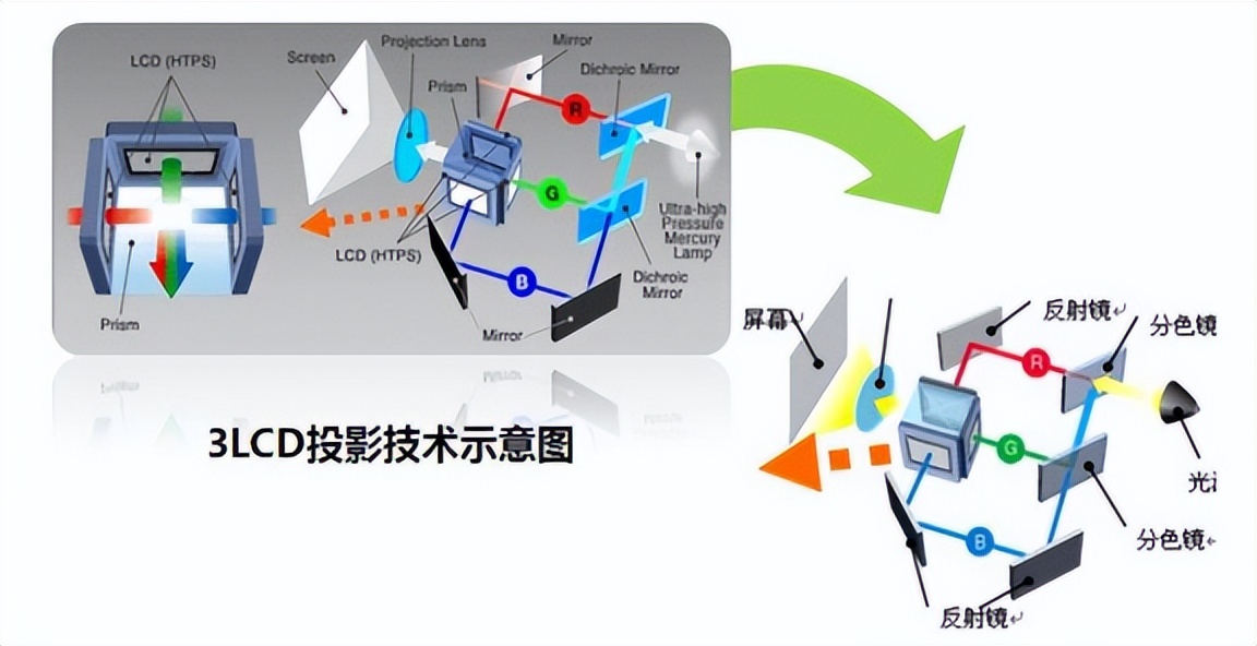 3LCD技术:主要由分光、LCD面板成像、彩色画面合成、画面投射四个步骤完成。