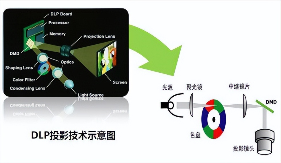 DLP的技术:将灯泡发射出的强光,经过均匀化处理后通过色轮,色轮会将光分成RGB三色(或者RGBW等更多色),分色后的光线再由透镜投射在DMD芯片上,最后由DMD芯片来完成投影画面动作、色彩的组合,经反射后在投影屏幕上成像。