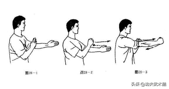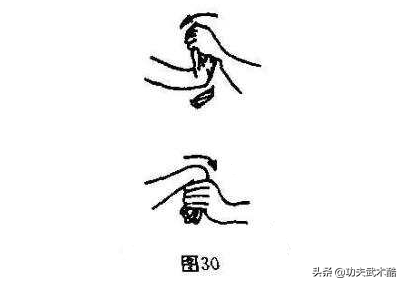 练习法:手抓握另一手,向伸腕方向有节奏压振20-30次,然后再向屈腕方向压振20-30次,连做3组、然后换另一手练,亦做3组,(图30)