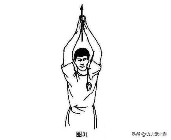 练习法:两手掌背相贴,两臂尽量于头部上方垂直上举伸展运动,反复练习10-20次X2组(图31)。