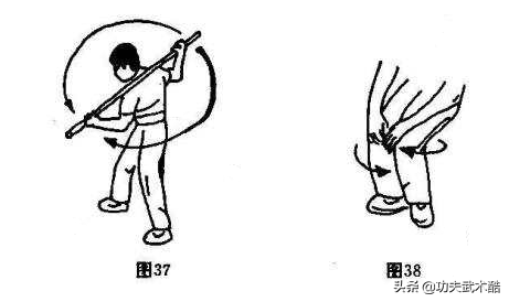 练习方法:两脚开立·两手分开抓握长直棍置于肩上,双脚不动,左右尽力向侧后扭转身体.反复练习30秒X3组(图37)。