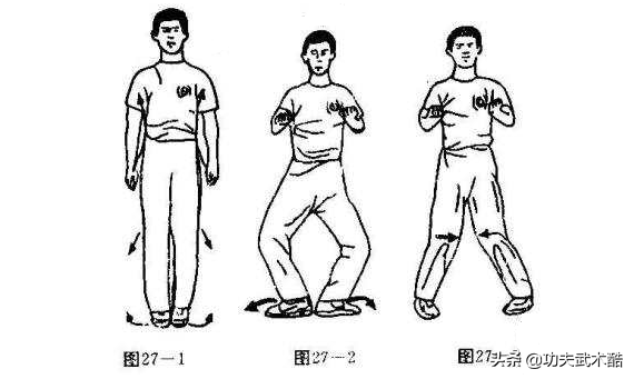 练习方法:首先开马(二字拑羊马)—全身放松,从立正姿势开始(图27-1),屈膝(膝尖朝外),双脚尖外转90度。双拳屈肘收至胸部高度(图27-2)。不停,双脚跟再外转45度,双膝曲膝内拑,重心靠后,即成二字拑羊马(图27-3)。