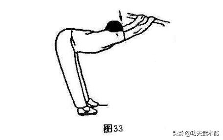 练习方法:两手扶器械或肋木,上体向下反复振胸压肩,将肩关节韧带拉开(图33).反复练习30次X2组。