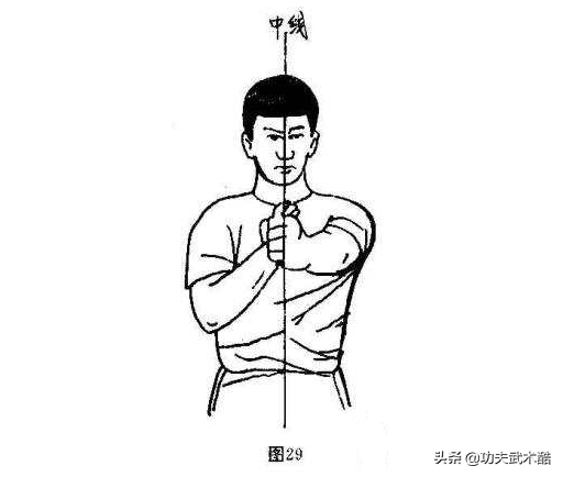 出拳时应遵循“守中用中”原则(如图29)一即每出一拳,手肘应贴近中线以肘发力,一直线将拳头打出,这样,由于双手始终保持在中线上,且每一拳均从另一手腕之上打出,从而使双手不断保持“封闭状态”.如此既可防止对方抢占中线,又可以最直接之攻击距离攻击对手,占尽机先。