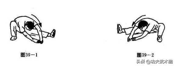 练习方法:一腿屈膝,一腿侧伸直腿(脚跟着地)。然后上体尽量向侧伸腿侧尽力前俯压振15-20秒(图39-1),然后再交换侧下另一腿15-20秒。(图39-2)
