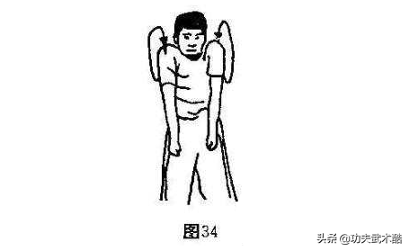 练习方法:双脚开立,·双肩作上下前后耸肩回环动作,反复练习10-20秒X 2组(图34)。