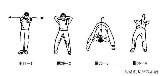 练习方法:两脚井立.两臂前伸然后向两侧扩胸10次(图36-1),不停,两脚分开,双手抱头。向前尽量俯身立起10次(图36-2,3),不停,再向后尽量仰身立起10次(图36-4)。