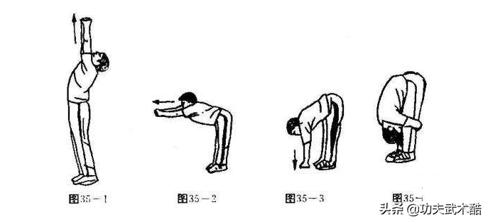 练习方法:双脚并立,双手交握向上(图35-1).向前(图35–2),向下(图35— 3)尽力伸展并保持5-8秒,然后上体前俯,胸部贴紧大腿,双手抱紧双腿保持5^-8秒(图35-4),如此反复练习三组。练习时注意动作幅度要大。