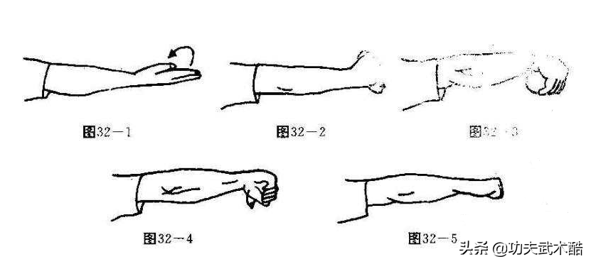 练习方法:开马(二字拑羊马),然后一手日字拳中线冲前打直后,拳头摊开,掌心向上(图32–1),不停.四指及手掌向上屈曲.随即由左至右逆时针弧形旋转(图32-2, 3),当手掌圈至将尽时。四指缓缓卷曲握拳(图32-4-5)收回后,换另一手同样动作,如此反复放松练习30秒~60秒X2组。动作过程中,手臂不可移动亦不可略有弯曲。