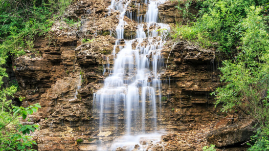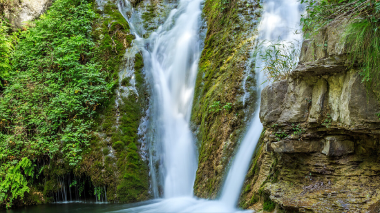 更为神奇的是,这一处瀑布很宽,如一幅宽大的门帘悬挂在崖壁。奔腾而下的水珠如一颗颗晶莹的珍珠,滚滚流入山间石缝之中,荡起一圈圈的涟漪,向远处扩散,渐渐平息,汇入山间溪流。距这处瀑布两三米的地方,是另一处小的瀑布。这个地方则是满布苔癣,在水的不断冲洗下越发碧绿。晶莹的水珠,碧绿的崖壁交相浑映。不由得让人停下脚步,久久不愿离开。置身这样的美景之中,人生多少的不如意,都会烟消云散,留下的只是心旷神怡。