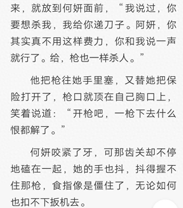 第二个地方是傅慎行找来梁远泽放何妍他们离开,对何妍说,阿妍,别回头,一直往前走,永远别回头,随后一声枪响,何妍知道是傅慎行自杀了,这时候她是开心的吗?我觉得并不是,她泪流满面,浑身颤抖,她内心深处并没有希望他死。