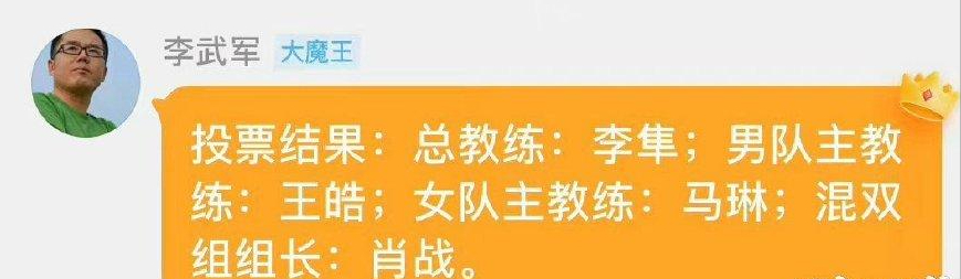 经过三天的竞聘,国乒总教练、男女乒主教练和混双组长的竞聘投票结果已经出炉。据央视乒乓球专项记者李武军内部消息透露:李隼将担任国乒总教练,王皓担任男乒主教练,马琳担任女乒主教练,肖战出任混双组长。秦志戬被刘国梁委以重任,专心担任乒协秘书长,不再兼职国乒的教练工作。