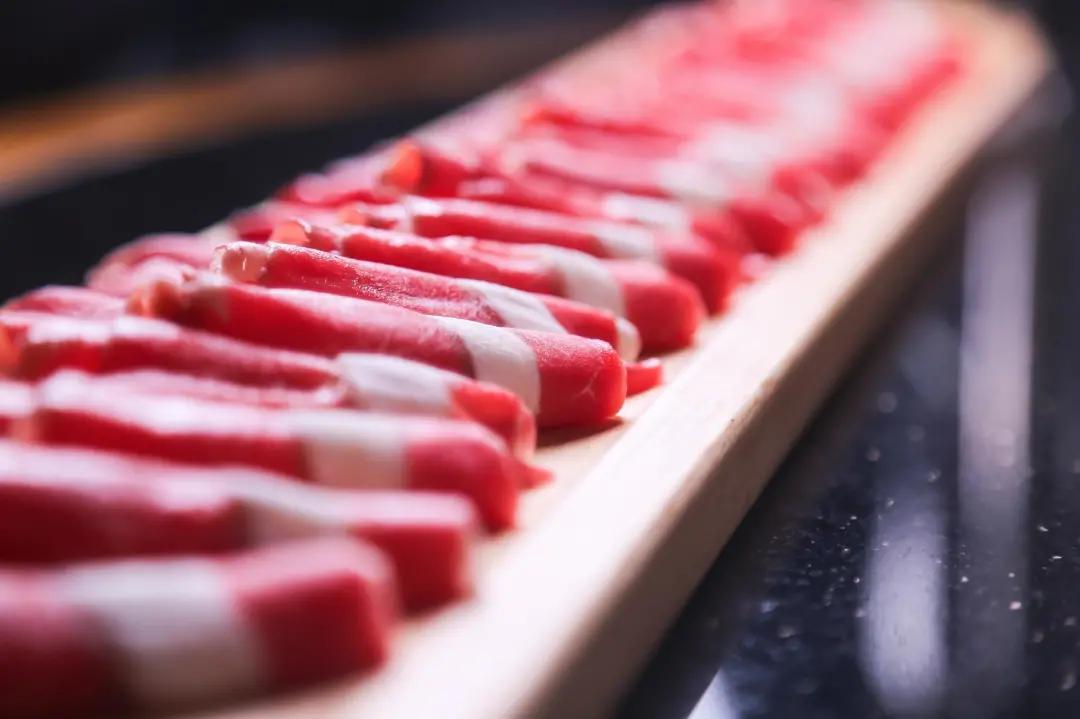 从肥牛二号开始,就不是原切肥牛了,而是用瘦肉和脂肪压制成的肉砖。