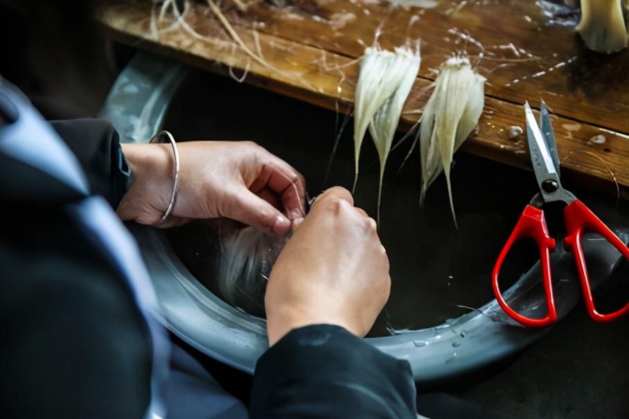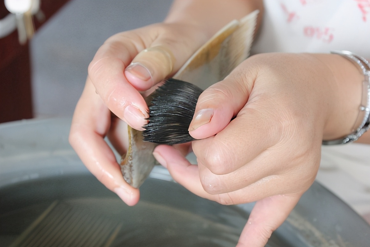 在制作过程中,湖笔一般采用优质的山羊毛,并且需要把毛料放入水盆进行工序处理,笔工会把毛料放入水盆反复清洗,并且还会逐根挑选出适合制作湖笔的并合理分配。