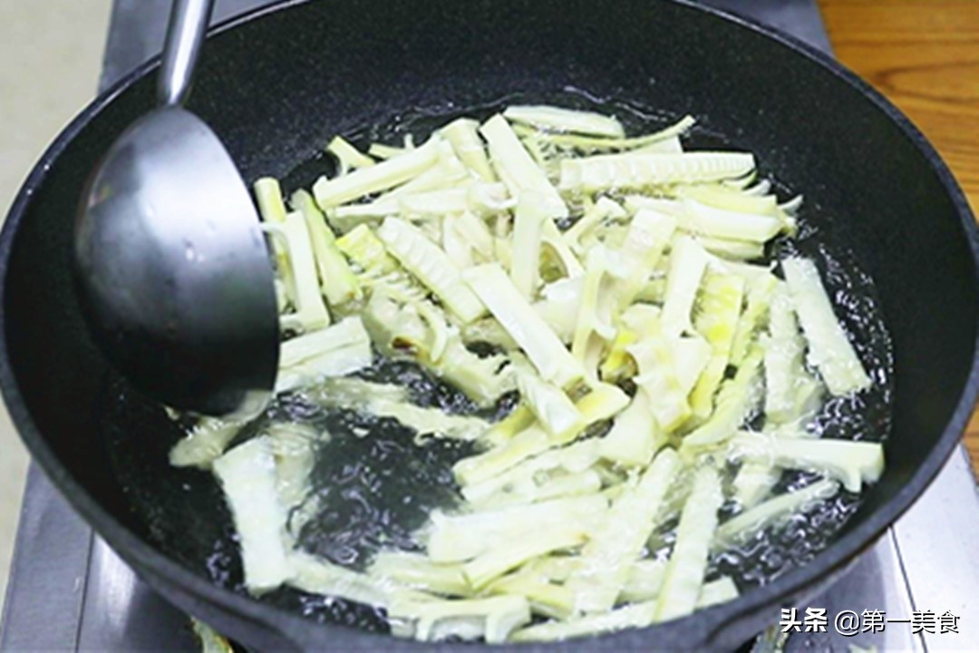 2.烧半锅开水,把春笋倒进去焯烫一下,既能方便炒熟还能去除苦涩味,煮个两三分钟就能捞出来控水了。