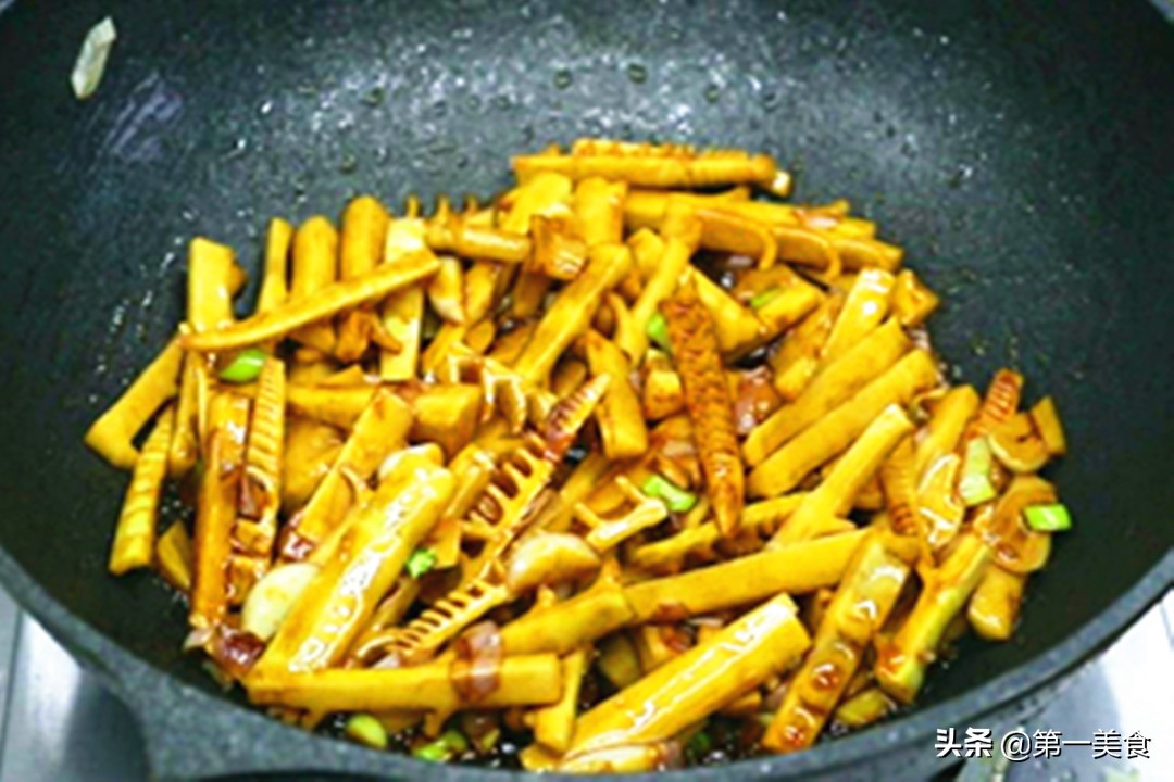 3.锅内烧油,放入葱姜蒜片爆香,倒入春笋大火翻炒均匀,加入食盐、白糖、味精、鸡粉、蚝油、老抽上色、生抽提鲜,做油焖春笋重点就在于油焖上,中小火慢慢的熬,把水分烧干、 剩下的就是油和调料,一直熬成这种浓油赤酱的感觉。