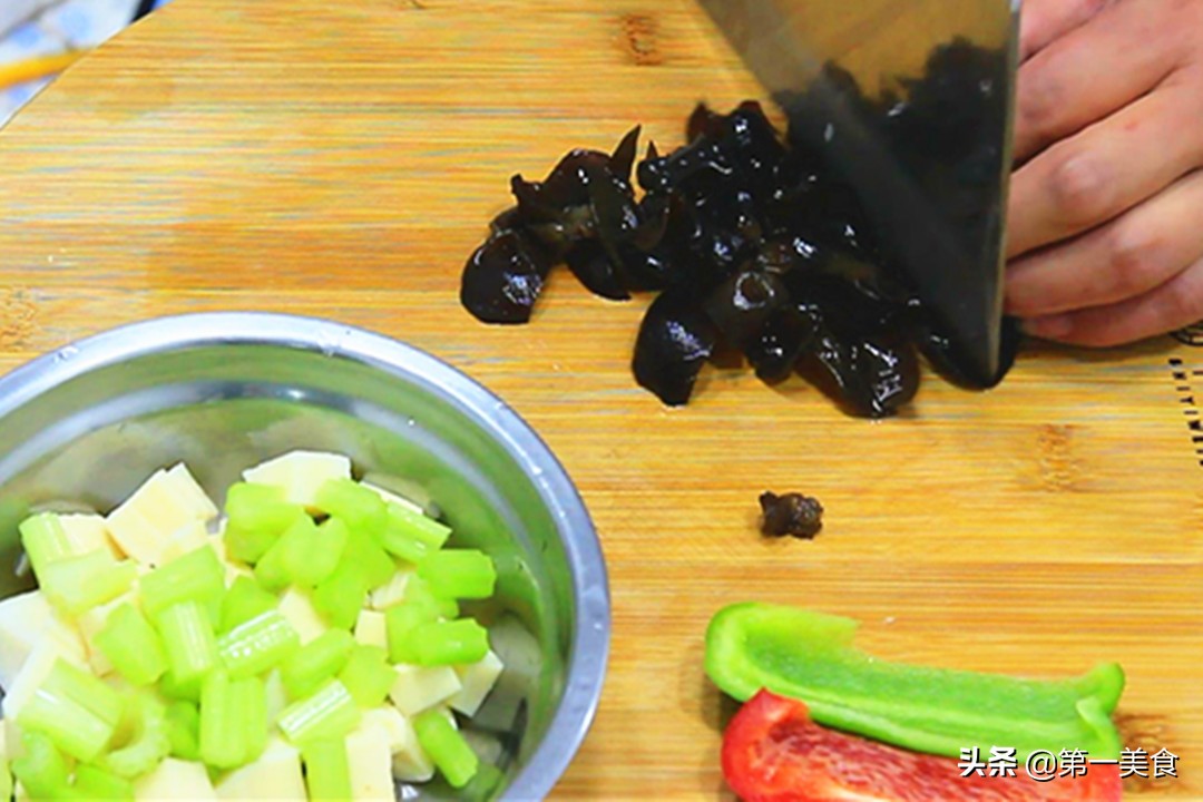 2.嫩笋芽切成丁;芹菜切小段;泡发的木耳切小块;再切一点青红椒丁搭配颜色。