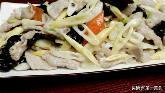 1.一块上好的里脊肉,把它冻到半硬的状态,然后切成片,肉片里面加入胡椒粉、食盐、鸡粉、料酒快速地搅拌均匀,再倒入一点水淀粉包裹着肉片,为滑嫩的口感做好铺垫,再加入一些植物油,避免肉片之间互相粘连。配菜我选择了半根胡萝卜, 把它切成菱形片,适量的春笋,也切成片备用。