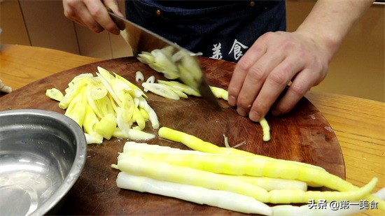 把春笋从中间破成几半、切成段,放入开水锅中,中火煮4分钟左右,利用高温充分溶解里面的草酸,同时还可以加一点食用碱进去,去除春笋的涩味,煮透以后捞出来,迅速的过凉保持脆嫩的口感。