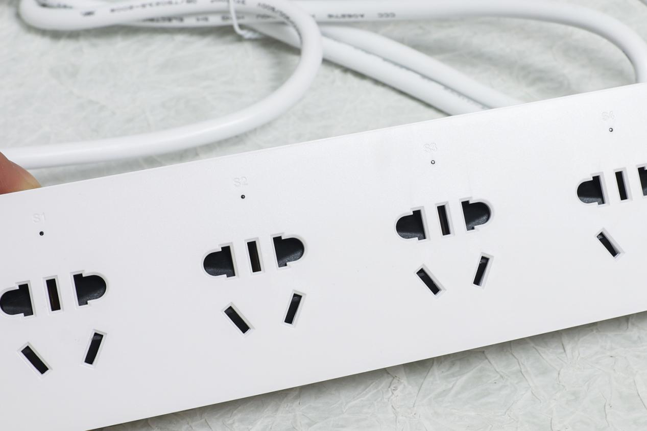 向日葵智能插线板P1每个插孔都有独立安全门,并标注了S1、S2、S3、S4字样,顶端是一枚总开关和logo标识。