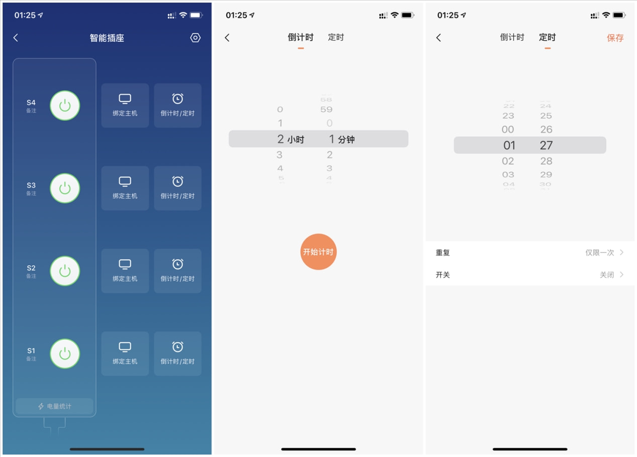 如图所见,这就是连接好之后的向日葵智能插线板P1,由于还没绑定电脑主机,所以现在大家看到的主界面有S1、S2、S3、S4字样,这时就可以随意远程控制每一个孔位了,且每个孔位能够支持绑定不同主机电脑,最大支持四台,还有就是可以设置倒计时开/关、定时开/关,十分方便。