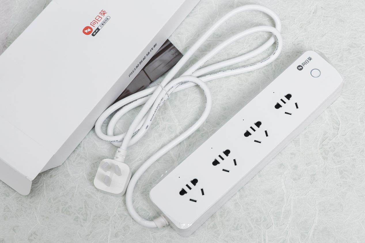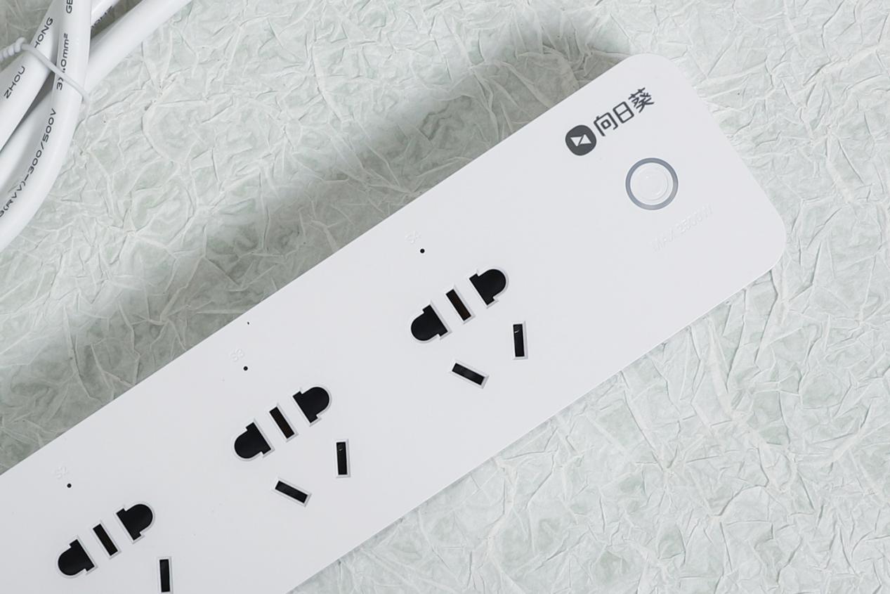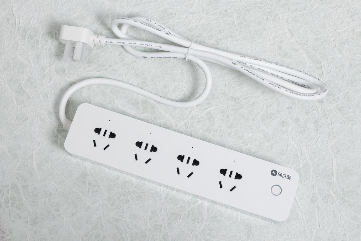 白色搭配,看起来很简洁美观,本来是打算买向日葵智能插线板P2的,但是发现P2只有三个插孔不够用,所以最终还是选择了P1版本,向日葵智能插线板P1有4个五口标准插孔,一般日常够用。