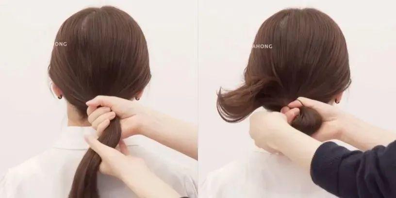 1、绑一个马尾,建议马尾的高度在两侧耳朵往后脑杓的水平线上,以避免太高发量不够,太低显老气。