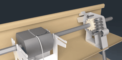 现在来看最上端另一边隐藏着另一个小机关。右侧是一个涡轮蜗杆结构,左侧就是把拉绳给夹紧了…等我们手动去转塑料杆子,就带动上方的传动轴转角度了。