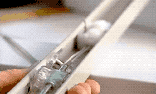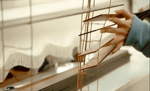 而正确的放下百叶窗的方法是,把百叶窗的两根绳子向内拉扯的,一扯就完全松下来了。咦?是不是看到同样是斜着拉扯,如果「往外扯」只会让百叶窗落下一丢丢?我们一起来看小机关~