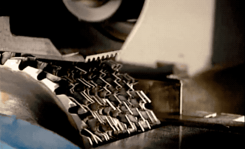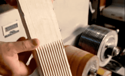 单片的百叶扇是被十几个并联的锯片同时给切出来的,一长条的木材进去。之前在《牛角梳:怎么从圆圆一个大牛角到平平无奇一把梳?》中问怎么不能一口气做出梳齿的小可爱,这是同样的操作工具!