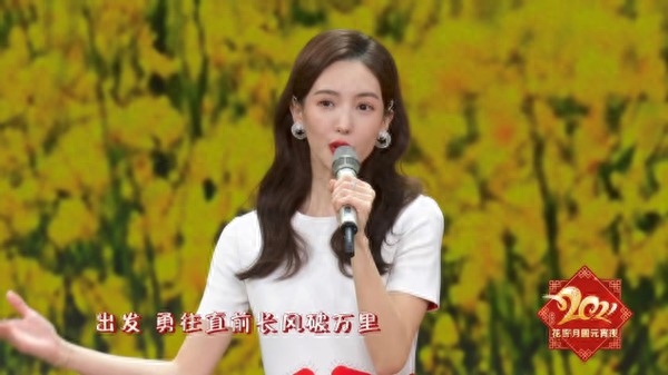 金晨当天穿了一件圆领白色连衣裙,上面还有红色菱形图案的装饰,为服装增添了一份活力,让她的形象既端庄也不失亲和力,非常贴合歌曲的正能量主题。