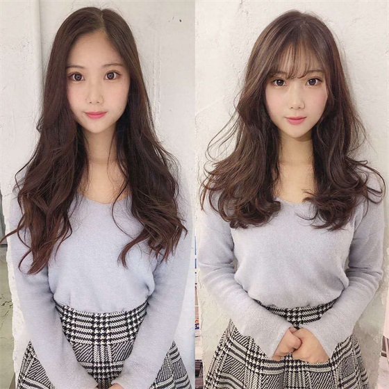 ⑧ 设计前的头发属于无刘海的长卷发,已经染了巧克力色,但因为没有刘海,脸型又圆,额头显得有点大。