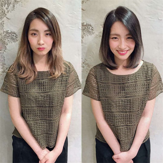 设计后的发型:剪掉干枯毛躁的发梢,换成了锁骨长度的梨花头,又重新换了发色,不仅头发恢复了光泽度,脸型也得到了美化,整个人的气质都提升了一大截。