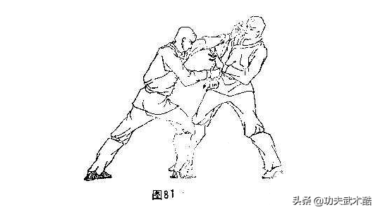 ①当乙上右脚用其右手向甲腰部打来,甲撤左脚,使乙右手放长,甲右手抓住乙右手斜拉,甲左手顺乙右臂去抓乙的脸,对方必然仰身抽手(图81)。