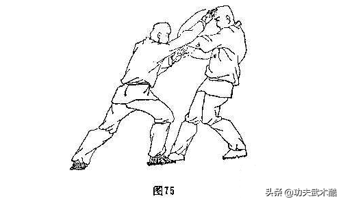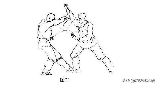 ①甲上右脚用右掌从怀里反背盖打乙脸部,甲左手护己右肘,以防乙来按甲右手,此是虚势,打中也好,打不中也好,一出即回,而乙必然出左手接架(图75)。