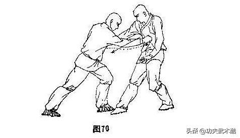 ①乙上右脚用其右手向甲腹部打来,甲撤右脚,提左脚落在乙右脚外侧,甲用左手搂开乙右手,甲用右手正拳击打乙的关元穴(图70)
