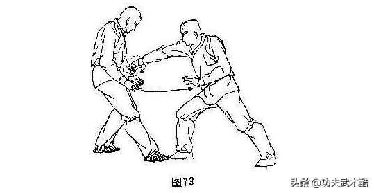 ①乙上右脚用其右手向甲打来,甲先撤左脚,吸胸坐步,使乙手臂放长(图73)。