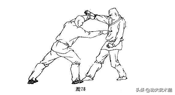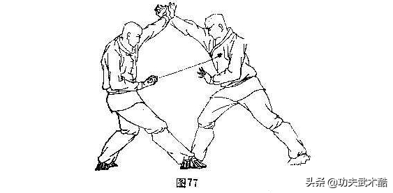 ①乙上右脚用其右手向甲头部打来,甲撤左脚,使乙手臂放长,懈掉其猛劲,甲左手向外滚拨引开乙右手(图77)